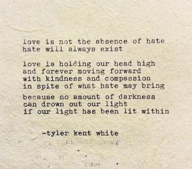 "Love is not the absence of hate; hate will always exist. Love is holding our head high and forever moving forward with kindness and compassion in spite of what hate may bring, because no amount of darkness can drown out our light if our light has been lit within.” – Tyler Kent White