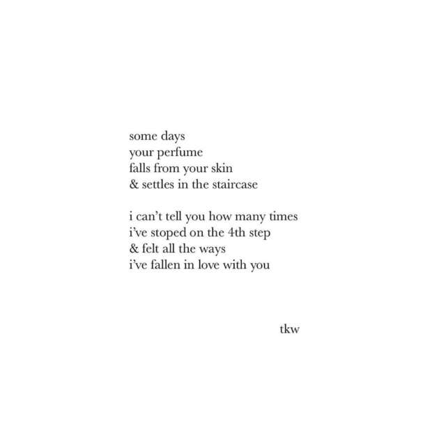 "Some days, your perfume falls from your skin and settles in the staircase. I can’t tell you how many times I’ve stopped on the fourth step and felt all the ways I’ve fallen in love with you.” – Tyler Kent White