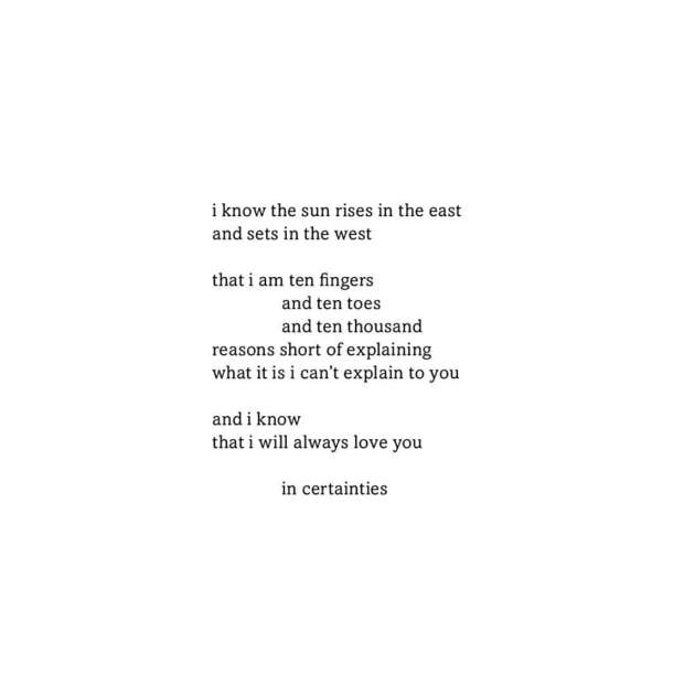 "I know the sun rises in the eat and sets in the west, that I am ten fingers and ten toes and ten thousand reasons short of explaining what it is I can’t explain to you. And I know that I will always love you in certainties.” – Tyler Kent White