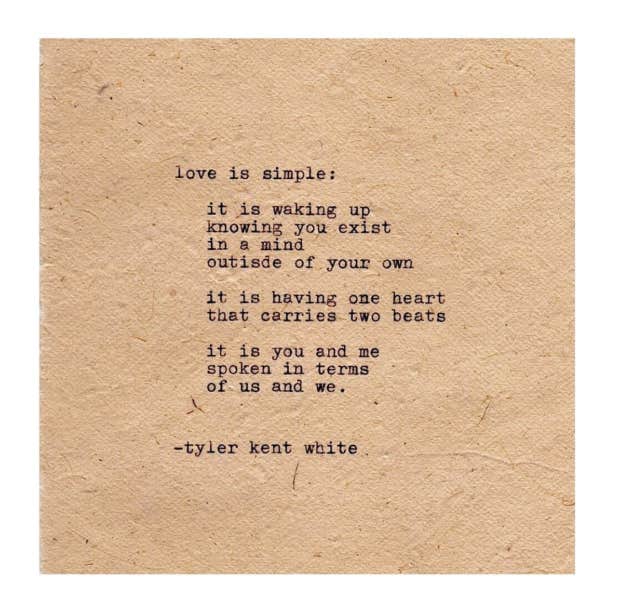 "Love is simple: It is waking up knowing you exist in a mind outside of your own. It is having one heart that carries two beats. It is you and me spoken in terms of us and we.” – Tyler Kent White