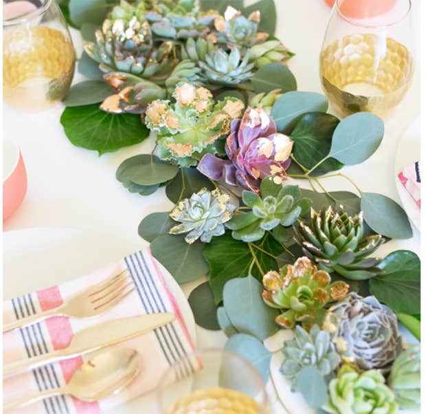 These au naturel DIY table runners are definitely statement pieces. They’ll turn your wedding tables into a scene straight from a woodland fairy tale. The leaves can be real or fake, but make sure to buy succulents that are the real deal. You can paint on the gold and add bits of flowers or glitter as you see fit.