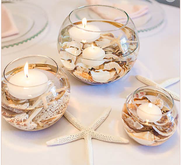 This romantic centerpiece is perfect for any bride and groom who want to bring beachy vibes to their wedding. They are extremely simple to make and set a romantic mood at the table. Whether you're celebrating seaside or are landlocked in Missouri, bring the beach to you. Just put the shells in the bowl and fill with water. Top it all off with a floating candle.