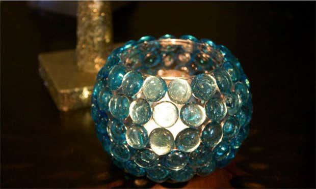 Want to bring a little magic to your wedding? These centerpieces create the romantic atmosphere that you’re after. This is a super-simple DIY centerpiece that will make a big impact on the room. Just hot-glue glass gems around each candle holder, and voila!