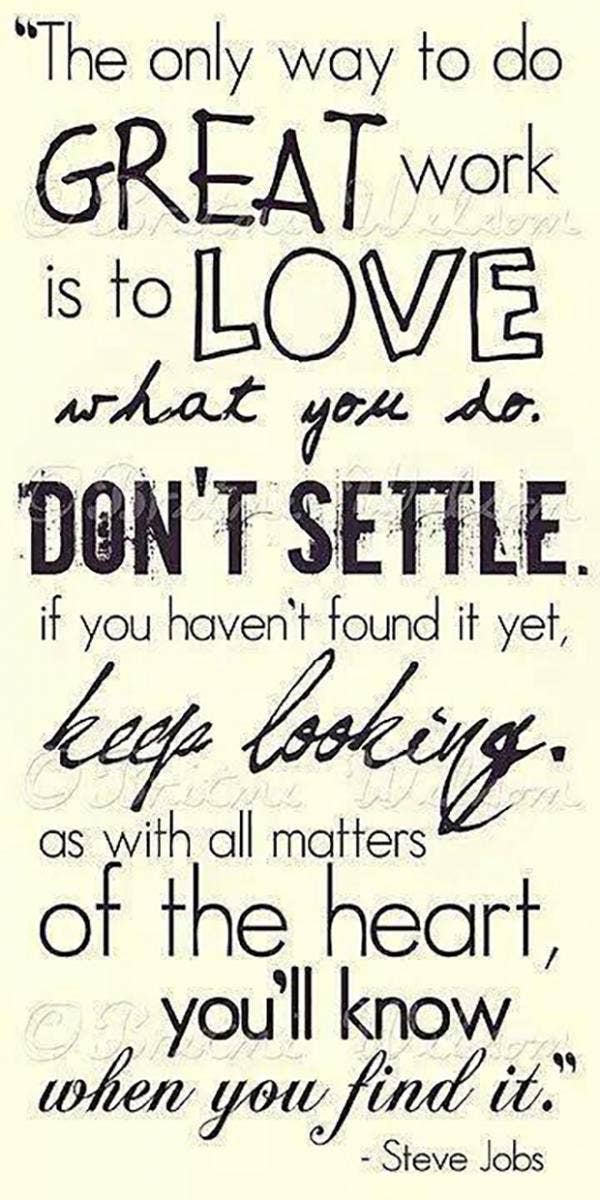 “The only way to do great work is to love what you do. Don’t settle. If you haven’t found it yet, keep looking. As with all matters of the heart, you’ll know when you find it.” -Steve Jobs