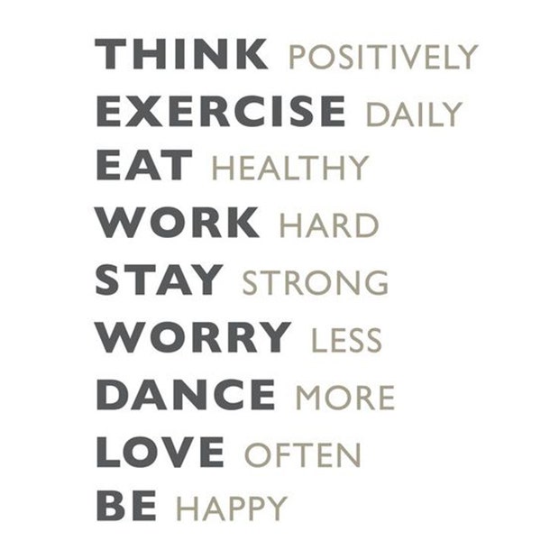 “Think positively. Exercise daily. Eat healthy. Work hard. Stay strong. Worry less. Dance more. Love often. Be happy.”-Anonymous
