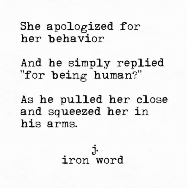 “She apologized for her behavior and he simply replied, ‘For being human?’ as he pulled her close and squeezed her in his arms.”—J. Iron Word