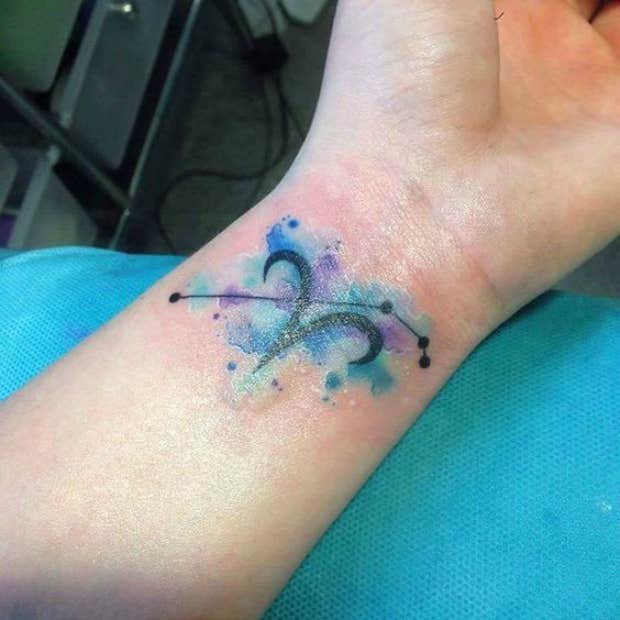 This tattoo is perfect for showing off, combining the zodiac symbol for the sign and a splash of watercolor, which you can do in any color that you like best!