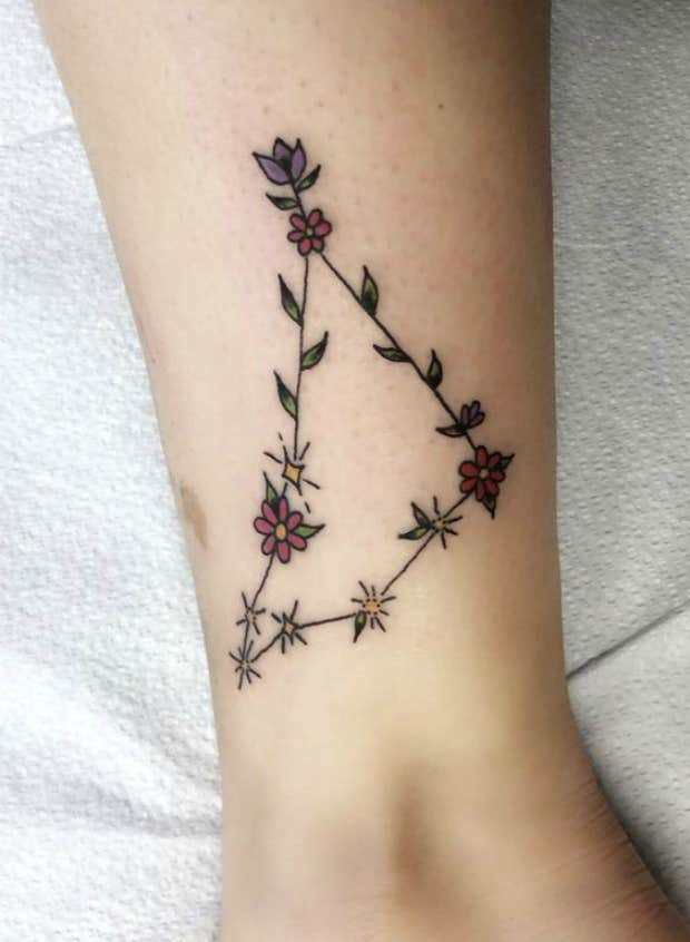 The Capricorn constellation may be a simple one, but it's certainly still beautiful. Bring a splash of beauty to your constellation tattoo by replacing the stars with flowers that are always in bloom.