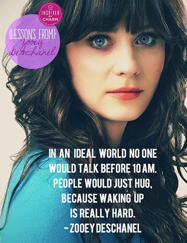 "In an ideal world, no one would talk before 10 am. People would just hug because waking up is really hard." -Zooey Deschanel