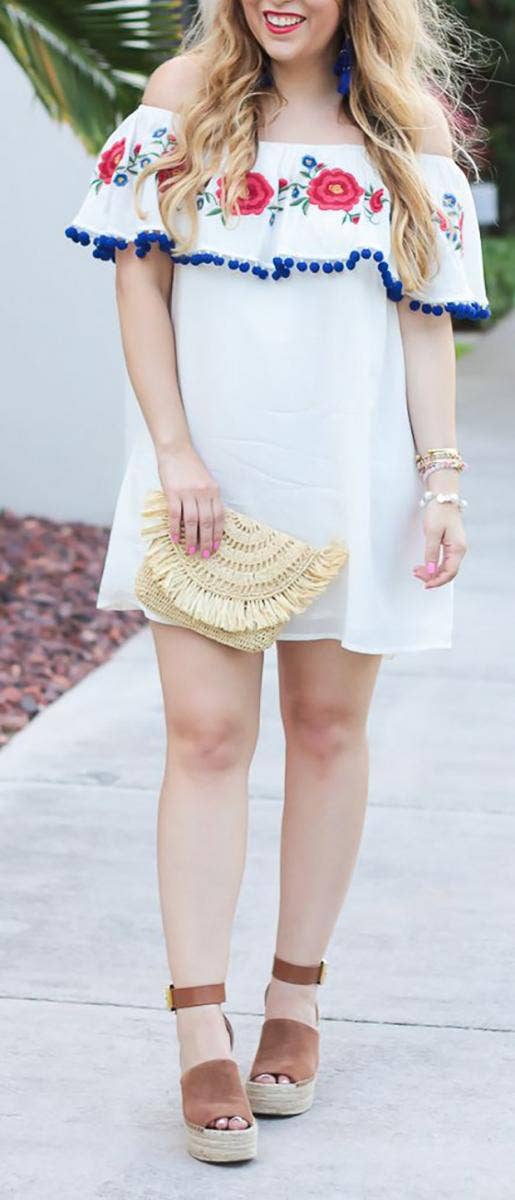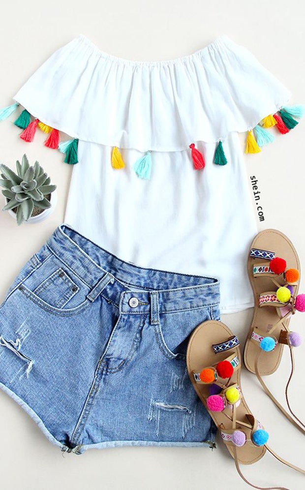 4. This off-the-shoulder top with colorful tassels and sandals will get you ready for margaritas in no time.