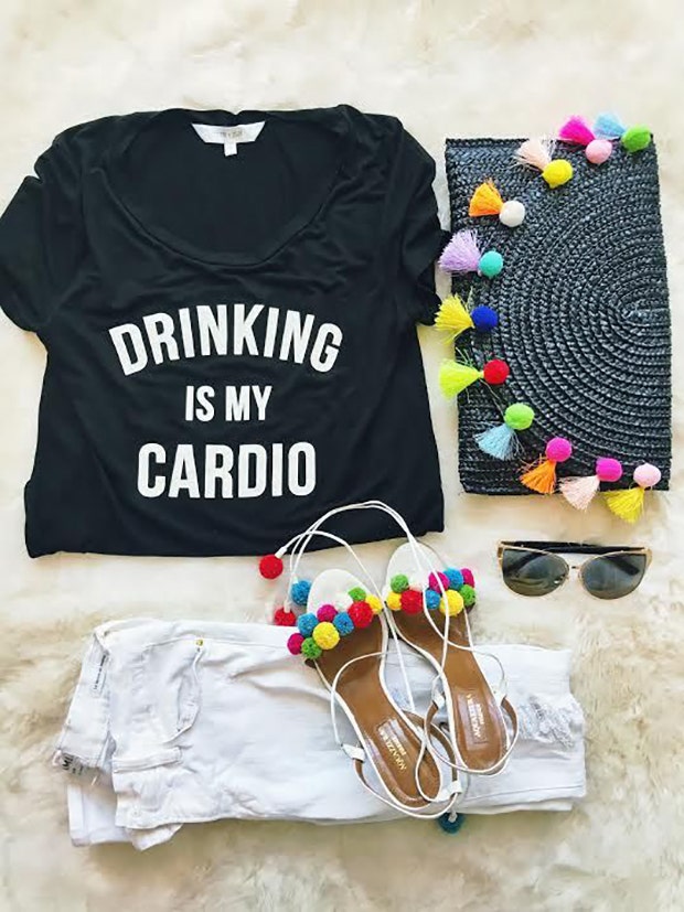 8. This 'Drinking is my cardio' shirt and colorful sandals is perfect for a backyard Cinco de Mayo party.