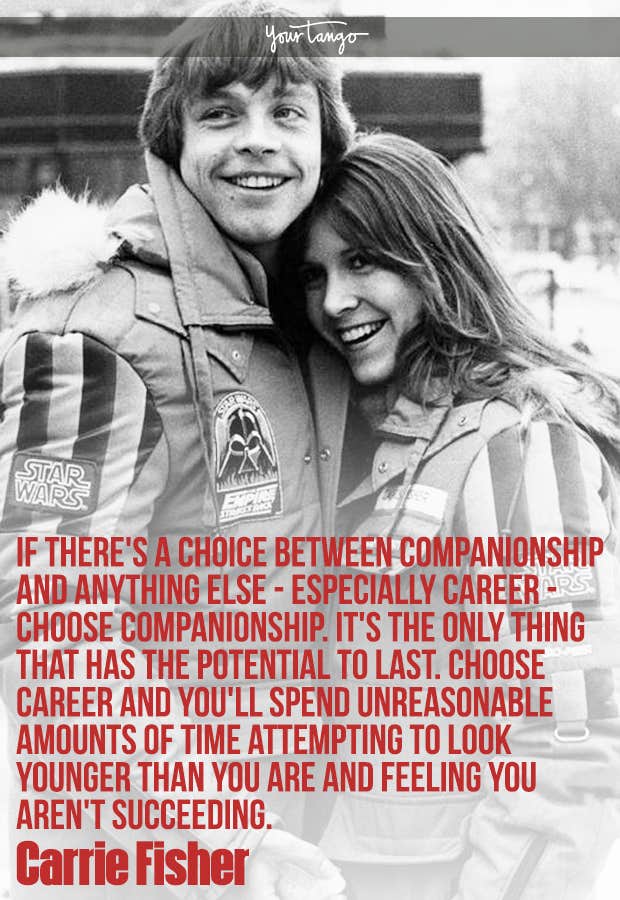 "If there's a choice between companionship and anything else — especially career — choose companionship. It's the only thing that has the potential to last. Choose career and you'll spend unreasonable amounts of time attempting to look younger than you are and feeling you aren't succeeding."— Carrie Fisher