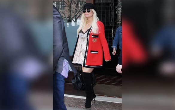 Does this look like a woman who is pregnant? We think not. It just looks like a woman who had a really bad wardrobe malfunction, especially trying to cover up that hideous negligee with a red blazer and thigh-high boots.