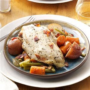 Who doesn't love a roasted chicken with potatoes and vegetables at the end of the weekend? Anyone who wants to enjoy their Sunday, that's who. Replicate the flavors of a Sunday chicken dinner with this super-easy slow cooker version.