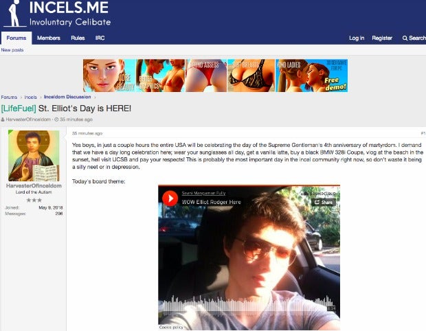 Self-described sexual outcast Rodger is now revered as a spiritual leader of sorts within incel subculture. Many in the community now speak of him as Saint Elliot, and they refer to mass killings by incels as "going ER" (i.e., going Elliot Rodger).