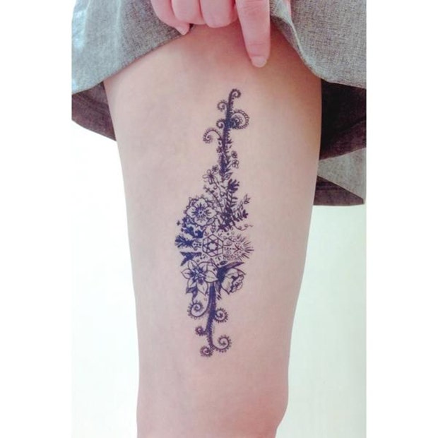 This elaborate temp tattoo looks best on the leg and is a mesmerizing array of flowers and shapes.