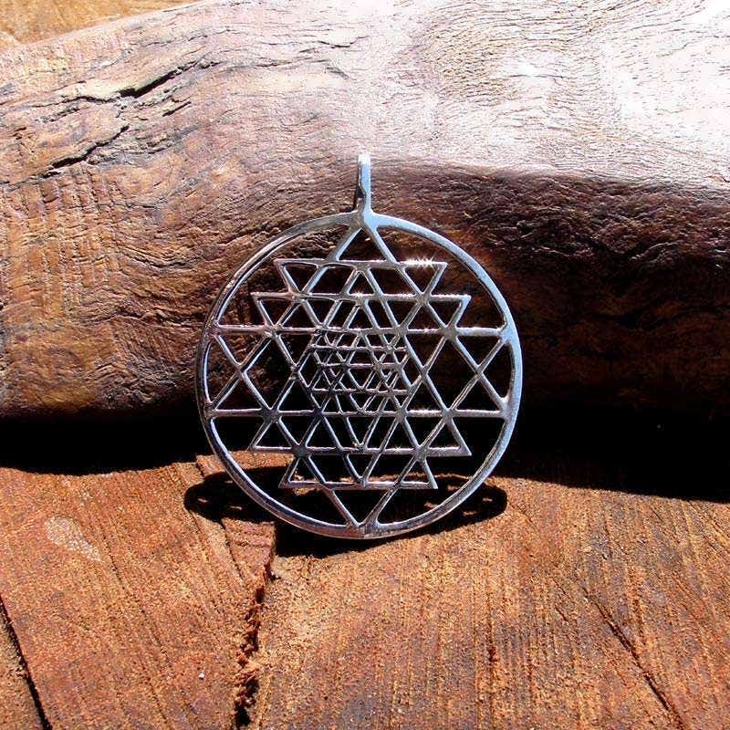 The structure of the Sri Yantra pendant is one that provides abundance, beauty, and balance between male and female and between spiritual and material. Yantra is a mystical Hindu concept that describes a structure or diagram used to balance or focus the consciousness in order to achieve spiritual comprehension. Wearing the Yantra as a pendant or observing a picture of it is intended to endow one with mystical or spiritual abilities.