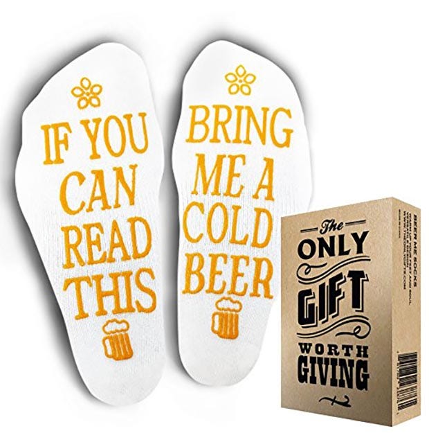 Hilarious and comfy — win-win. Just make sure you're willing to follow through on the beer run request that's printed on the bottom of both feet before you buy 'em!