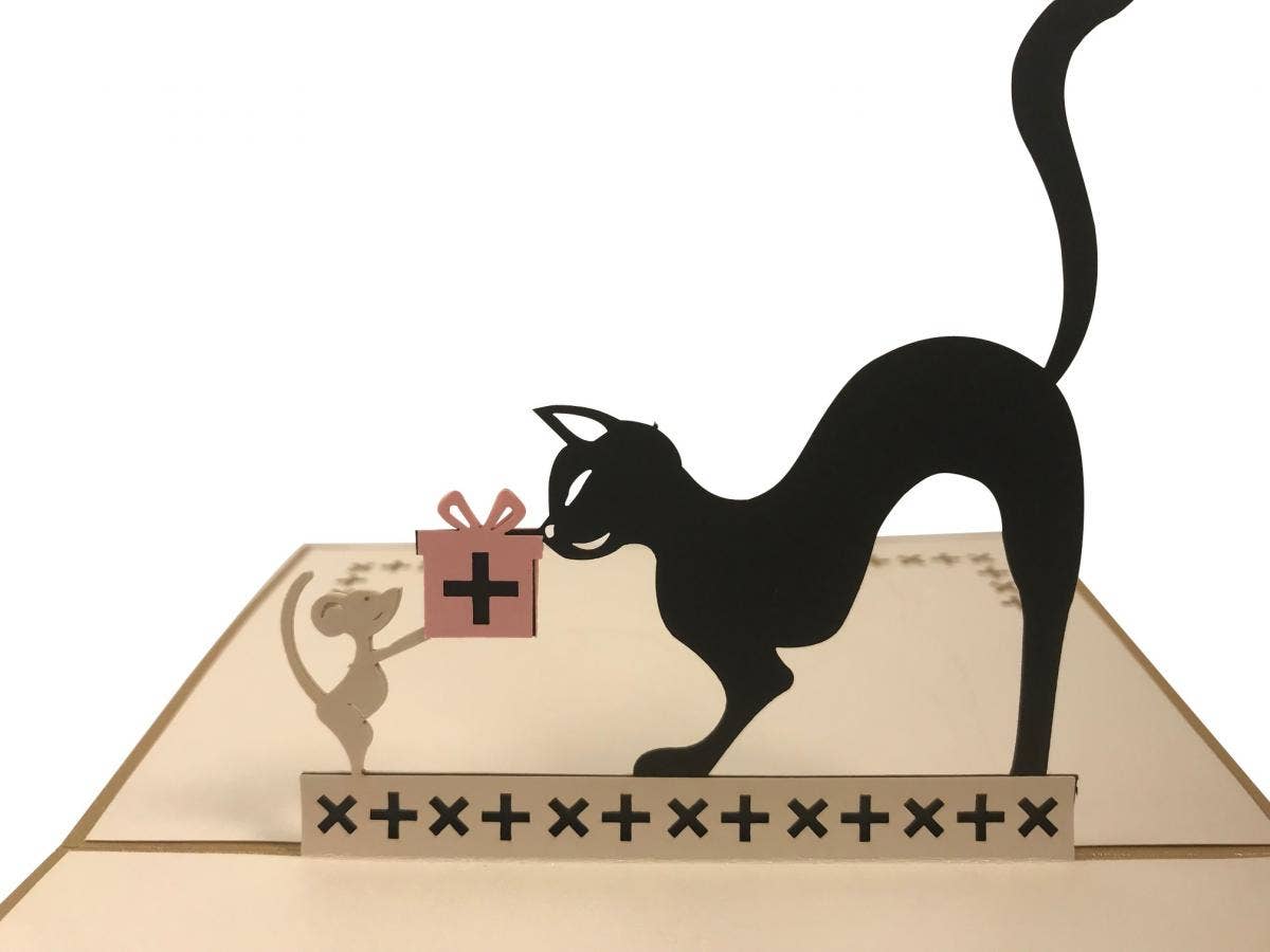 It's not only a greeting card, but also a gift. The front of this pop-up card features a happy little mouse looking up to a mischievous cat. This can be a fun party gift or even cool for your next brunch.