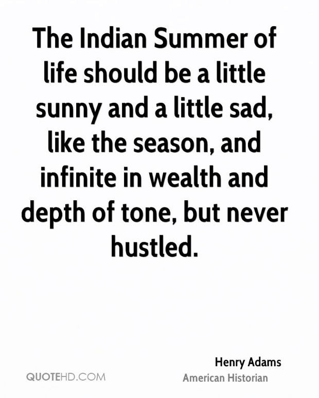 "The Indian Summer of life should be a little sunny and a little sad, like the season, and infinite in wealth and depth of tone, but never hustled." -Henry Adams