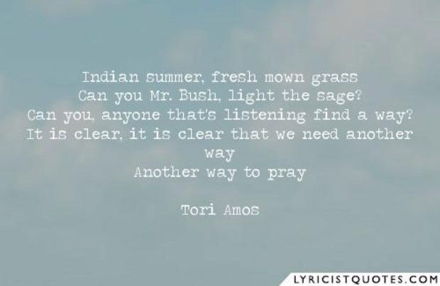 "Indian summer, fresh mown grass. Can you, Mister Bush, light the sage? Can you, anyone that's listening, find a way. It is clear, it is clear. That we need another way, another way to pray" -Tori Amos