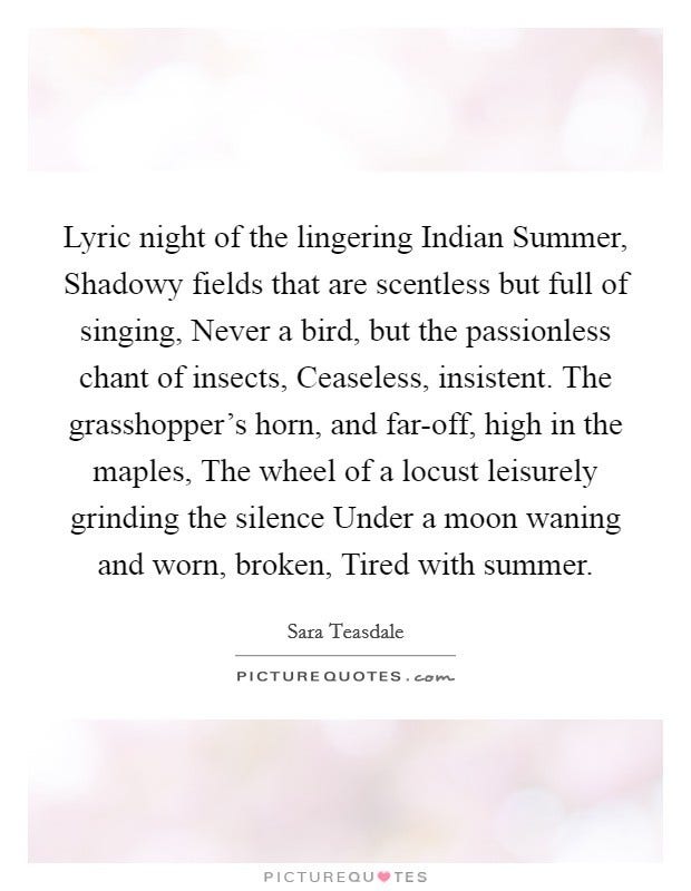 "Lyric night of the lingering Indian summer, Shadowy fields that are scentless but full of singing. Never a bird, but the passionless chant of insects, Ceaseless, insistent. The grasshopper's horn, and far off, high in the maples The wheel of a locust slowly grinding the silence, Under a moon waning and worn and broken, Tired with summer." -Sarah Teasdale