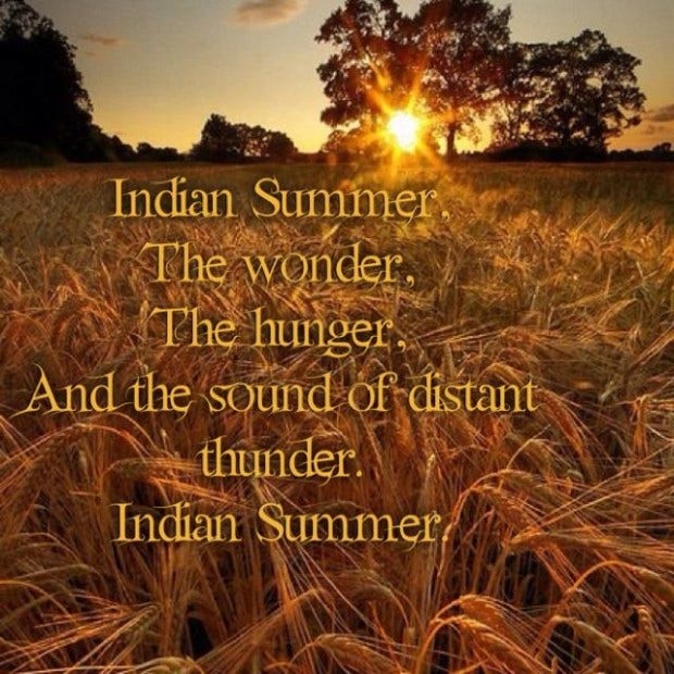 "Indian summer, the wonder, the hunger, and the sound of distant thunder, Indian summer."
