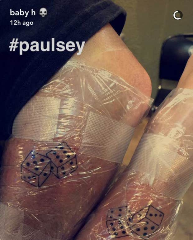Halsey got matching double dice tattoos with Paul Klein from the band LANY after doing a surprise performance at their show. Halsey reportedly tweeted earlier that day, “Who in Minneapolis wants to come tattoo me in my hotel room rn,” she tweeted, “Or wants to keep their shop open for me?”