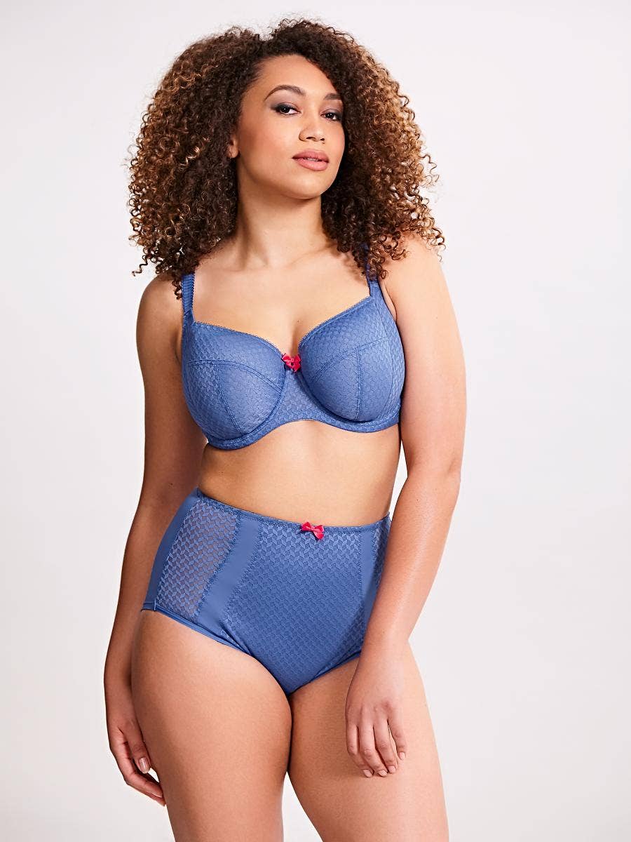 From the designers behind Panache (known to be the leader in bras in D+ cup sizes) Sculptresse is a “sister brand” that’s specifically designed for plus-sizes AND larger cup sizes. Band sizes run from 36-46, and this bra goes up to an HH. This bra has a multi-part underwire cup with a mesh lining, and subtle diamond print.