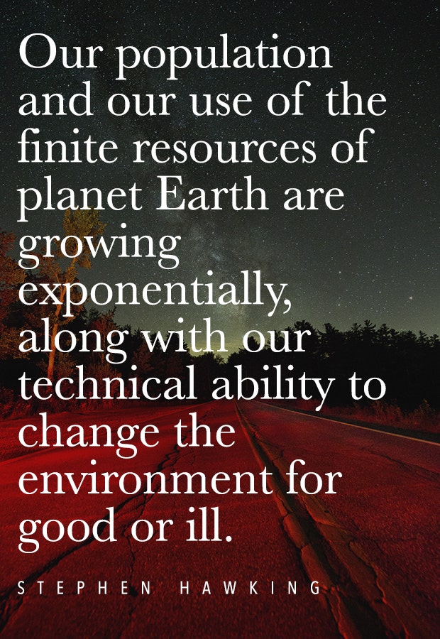 "Our population and our use of the finite resources of planet Earth are growing exponentially, along with our technical ability to change the environment for good or ill."— Stephen Hawking