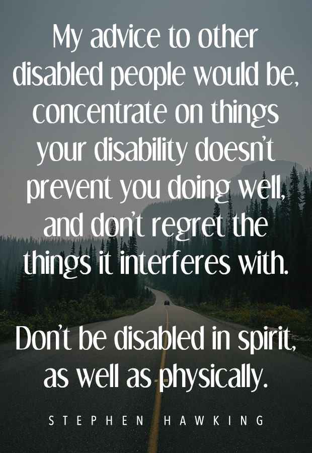 “My advice to other disabled people would be, concentrate on things your disability doesn’t prevent you doing well, and don’t regret the things it interferes with. Don’t be disabled in spirit, as well as physically.”— Stephen Hawking