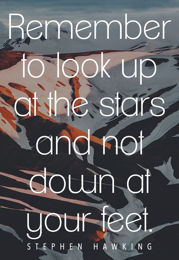 “One, remember to look up at the stars and not down at your feet. Two, never give up work. Work gives you meaning and purpose, and life is empty without it. Three, if you are lucky enough to find love, remember it is there and don’t throw it away.”— Stephen Hawking