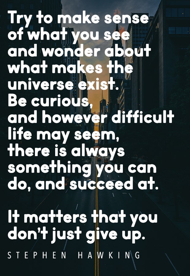 “Try to make sense of what you see and wonder about what makes the universe exist. Be curious, and however difficult life may seem, there is always something you can do, and succeed at. It matters that you don’t just give up.”— Stephen Hawking
