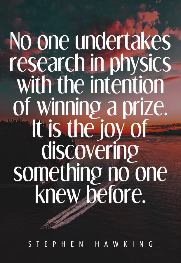 "No one undertakes research in physics with the intention of winning a prize. It is the joy of discovering something no one knew before."— Stephen Hawking