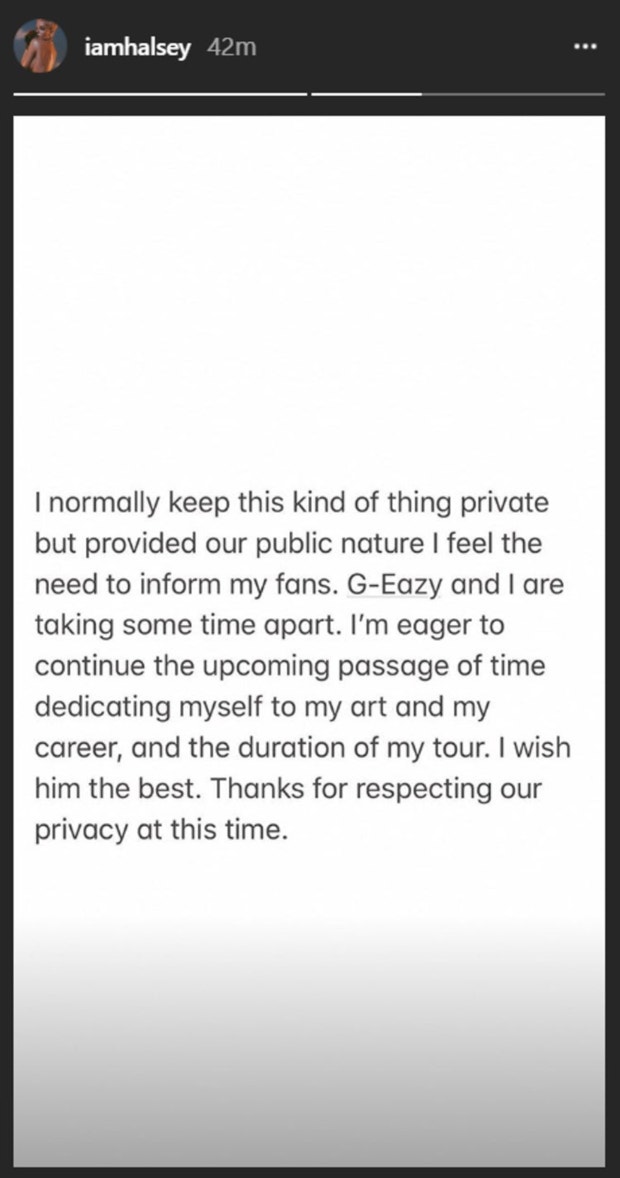 G-Eazy has yet to release a statement of his own, leaving fans speculating about the true cause of their breakup, with many of them seemingly on Halsey’s side.