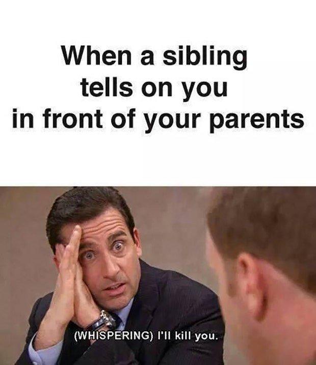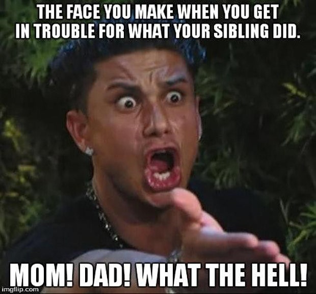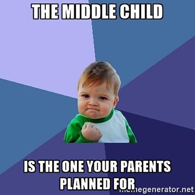 As the youngest, I'd like to apologize on behalf of all of us for taking your favorite toys, wearing all of your clothes, and basically ruining your childhood. But it isn't all bad! When you're the middle child you can get away with a lot more (and these funny sibling memes below prove it).