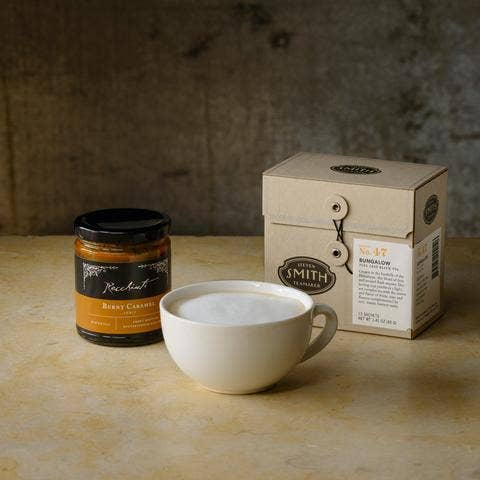These kits provide a recipe and everything you need to make the perfect holiday latte. A personal note to the recipient can be included before it is shipped. There's a choice of three kits: 1) Bungalow Crème Carmel (one string-tie carton of Bungalow Darjeeling, a 9 ounce jar of rich Recchiuti burnt caramel sauce, and a pinch of Jacobsen artisan sea salt); 2) Chocolate Chai (one string-tie carton of Masala Chai); 3) Chocolate Peppermint (one string-tie carton of Peppermint Leaves and one 9 ounce jar of Recchiuti Extra-Bitter Chocolate Sauce).