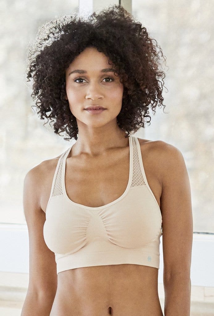 This bra is comfortable yet supportive and doesn't add bulk. It has a built-in plant-based and anti-microbial protection to safeguard against stains and odors. It's functional and lightweight, the next best thing to wearing nothing at all. Its removable pads and stretchy geometric lace inserts give it a modern feminine look that blends seamlessly under clothes.