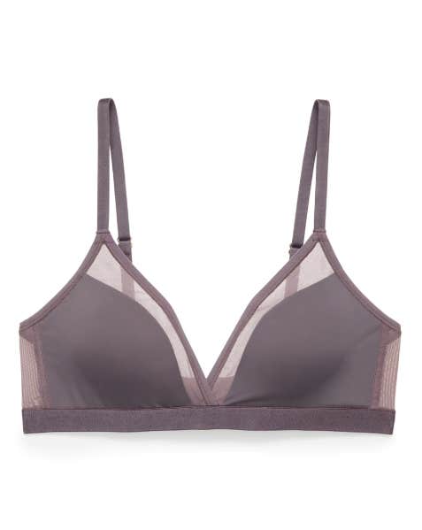 This modern, effortlessly sexy wireless bra with ultra-soft fabric and sheer mesh offers a flattering fit that disappears under clothes. The triangle cups have peek-a-boo mesh accents that provide the perfect modesty and shape without the bulk. It has fully adjustable matte straps, sleek fabrics thaat disappear under clothes, and elastic at bottom band for stay put fit.
