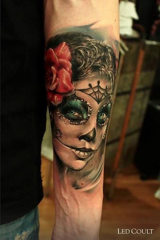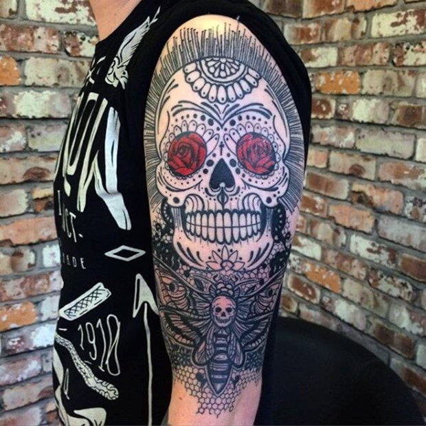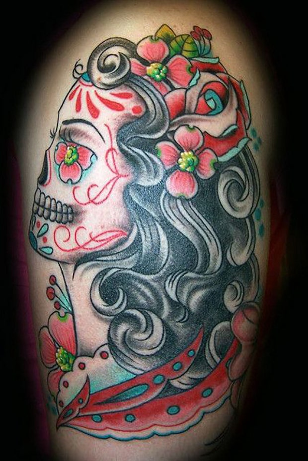 17. A sugar skull tattoo fits nicely onto a shoulder.