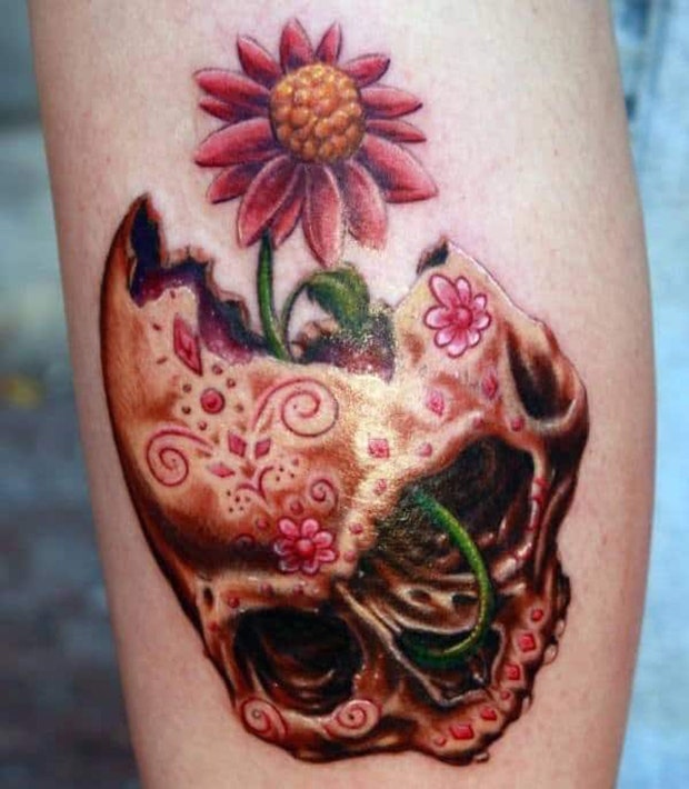While it's common to incorporate flowers into sugar skull tattoos, this one puts a creative spin on the idea by having the flower grow out of the (realistic) skull.