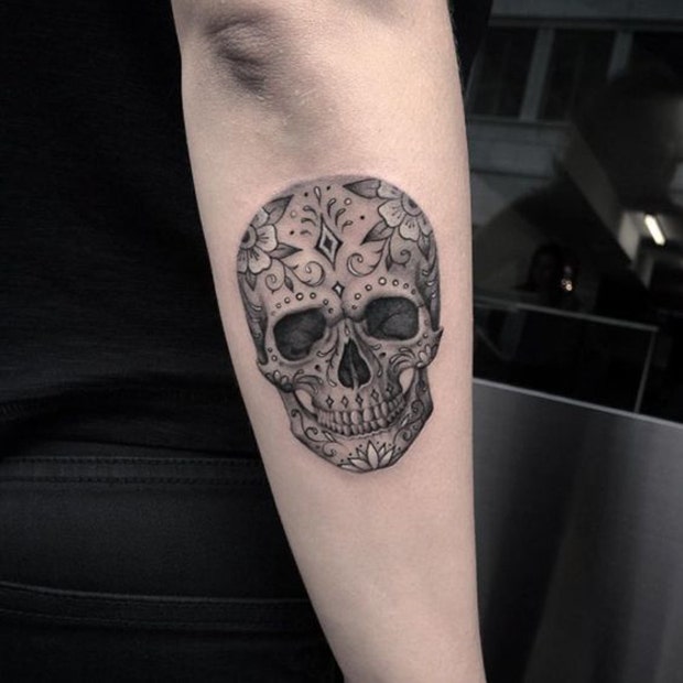 34. Another black and white sugar skull tattoo with some impressive shading.