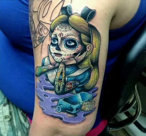 Alice in Wonderland tattoo pulls off the sugar skull look.