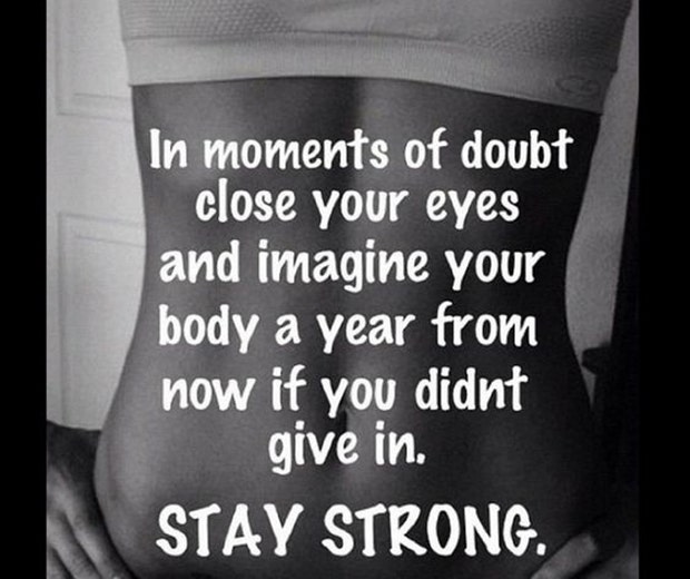 "In moments of doubt, close your eyes and imagine your body a year from now if you didn't give in. Stay Strong."—Unknown