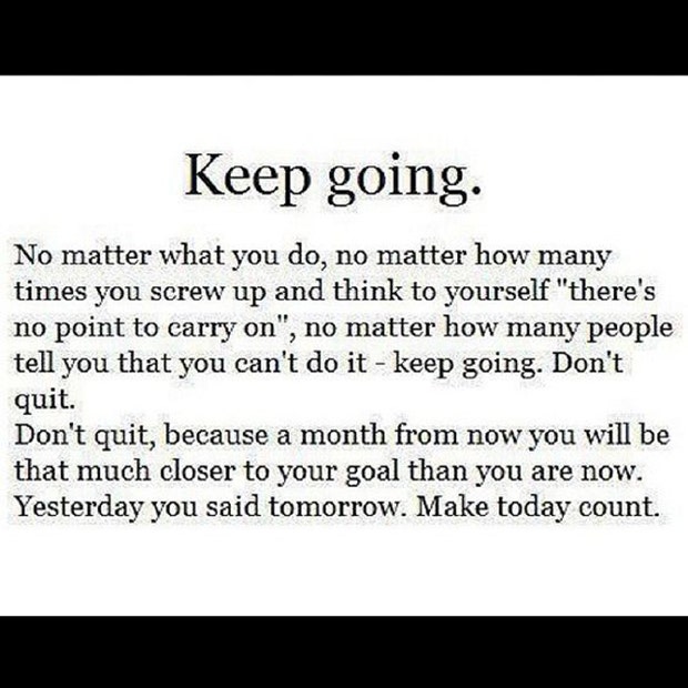 "No matter what you do, no matter how many times you screw up and think to yourself "there's no point to carry on", no matter how many people tell you that you can't do it-keep going. Don't quit. Don't quit, because a month from now you will be that much closer to your goal than you are now. Yesterday you said tomorrow. Make today count."—Unknown