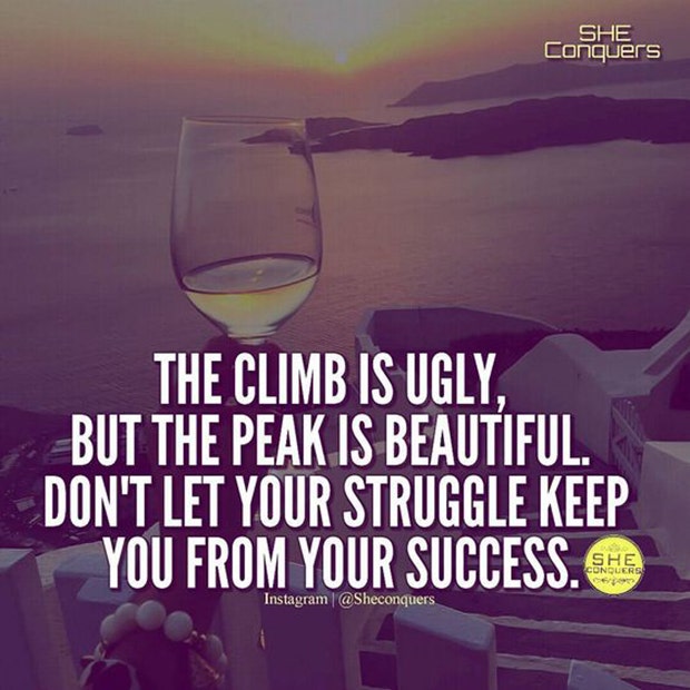 "The climb is ugly, but the peak is beautiful. Don't let your struggle keep you from your success."—Unknown