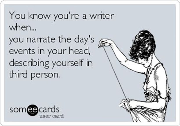 "You know you're a writer when...you narrate the day's events in your head, describing yourself in the third person." - Unknown