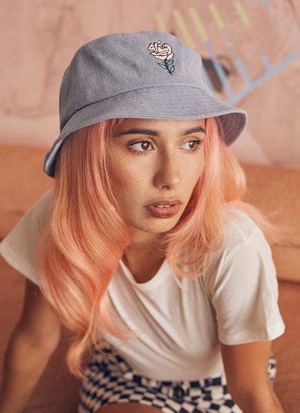 This blue corduroy bucket hat features an embroidered rose, a flat crown, and wrap-around brim, bringing the 90s back in all its glory!