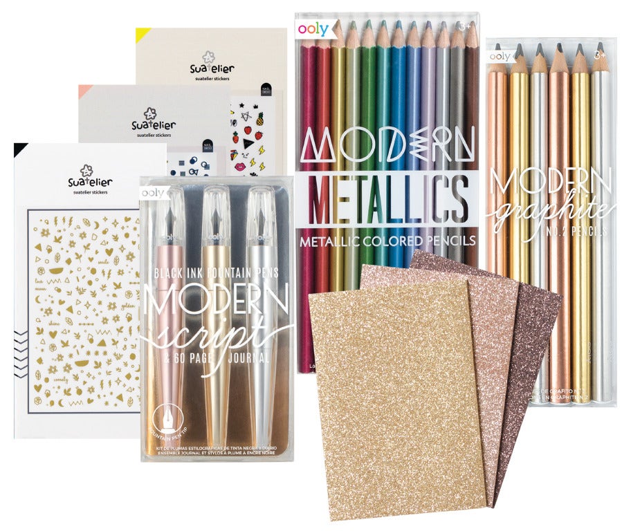 The gift set comes with basic writing tools anyone requires, plus a few creative ones too, all designed in metallic tones to style up your space. Includes: Modern Script Fountain Pens & Journal, Modern Metallic color pencils, Glamtastics glitter journals Deco stickers, Modern graphite pencils and sharpener.