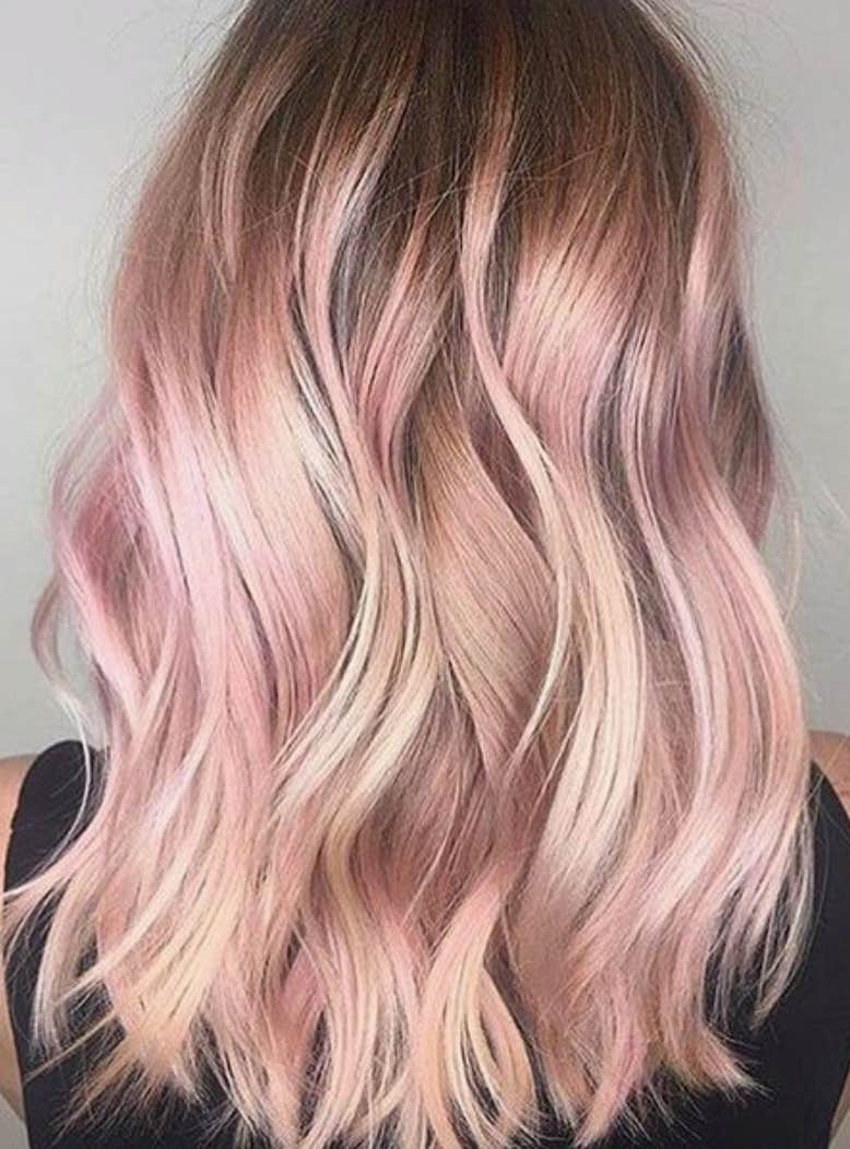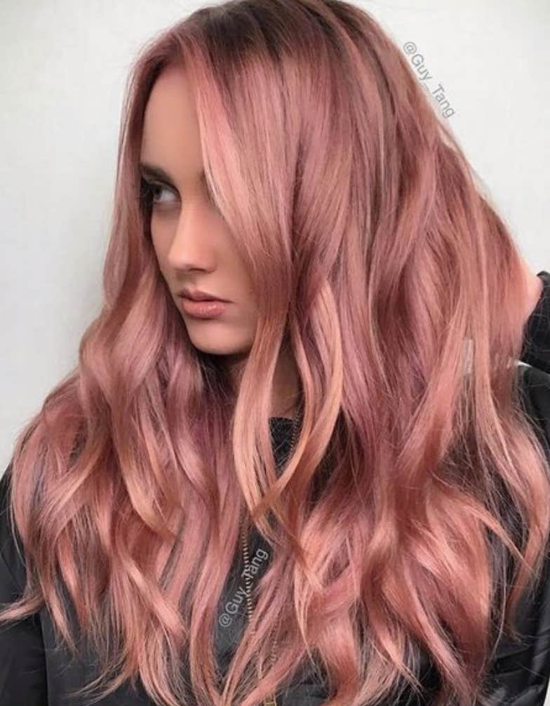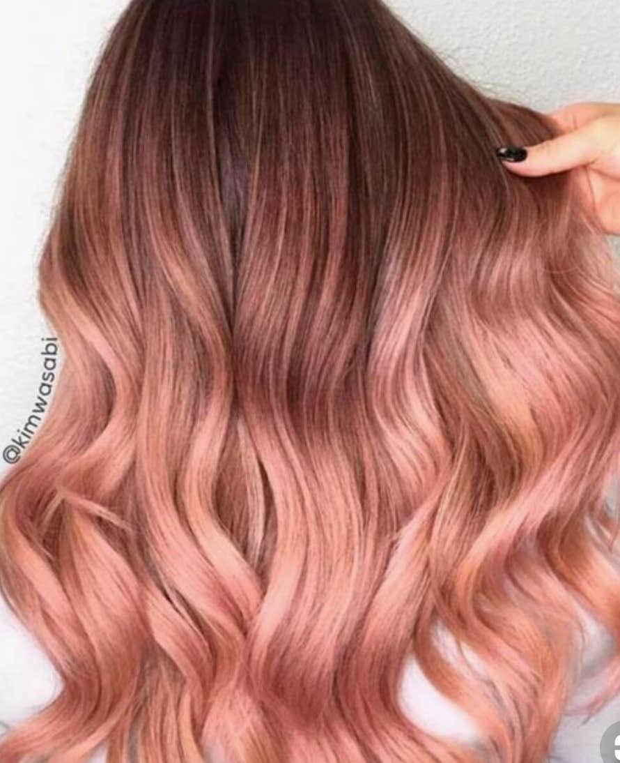 Perfect for a light blonde looking to go all rose gold. This look features an effortless root to end shade.